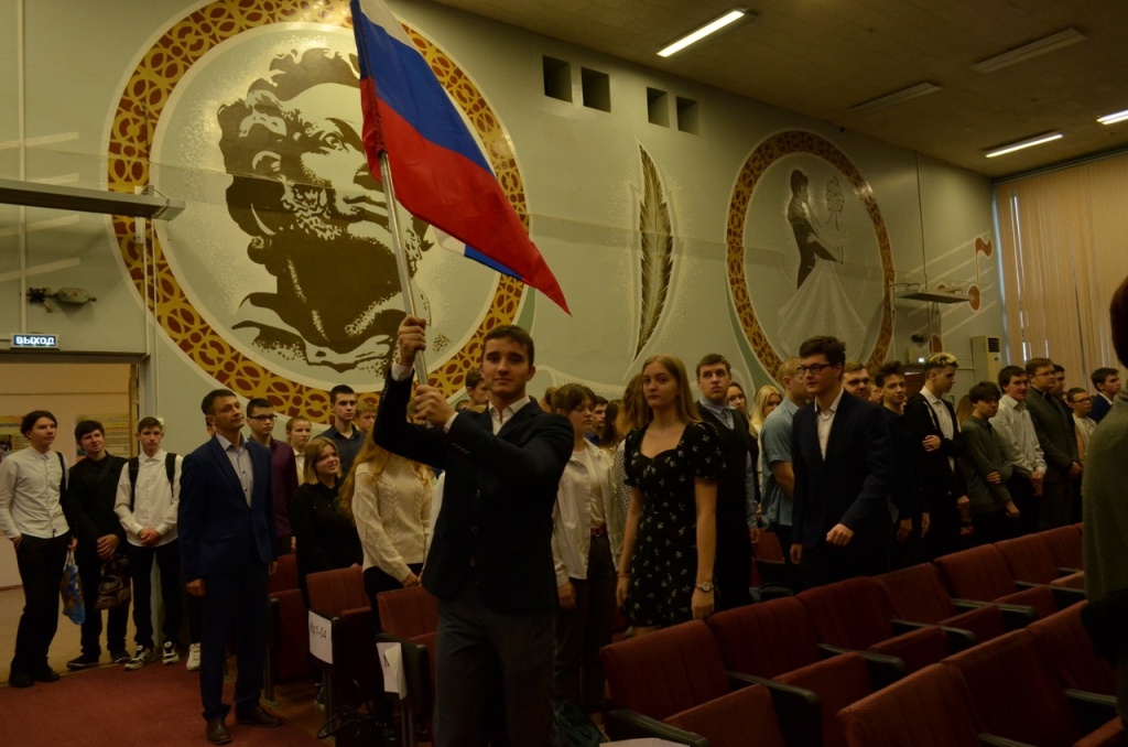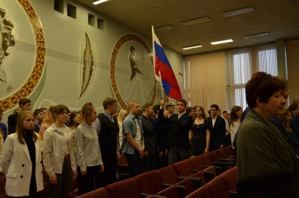 Начало линейки прошло с торжественной церемонии выноса флага Российской Федерации. Почётное право внести флаг Российской Федерации предоставилось отличникам теоретического и практического обучения 3 курса Алексею Пантелееву, Сергею Трунькину, Екатерине Шахватовой.