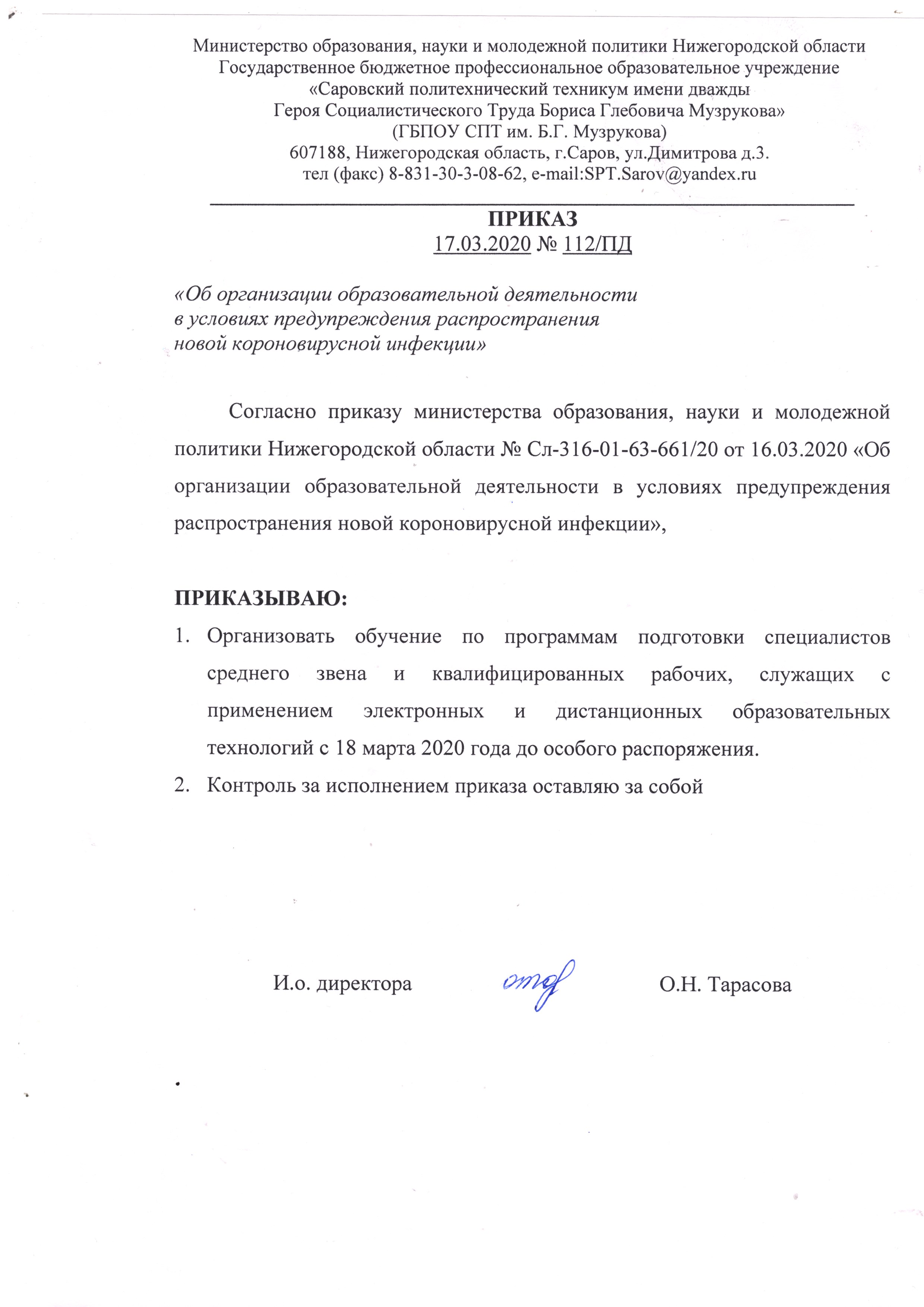- Приказ ГБПОУ СПТ им.Б.Г.Музрукова №112/ПД от 17.03.2020г. «Об организации образовательной деятельности в условиях предупреждения распространения новой коронавирусной инфекции»