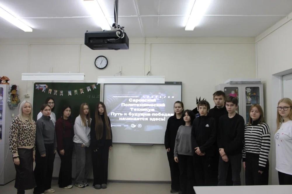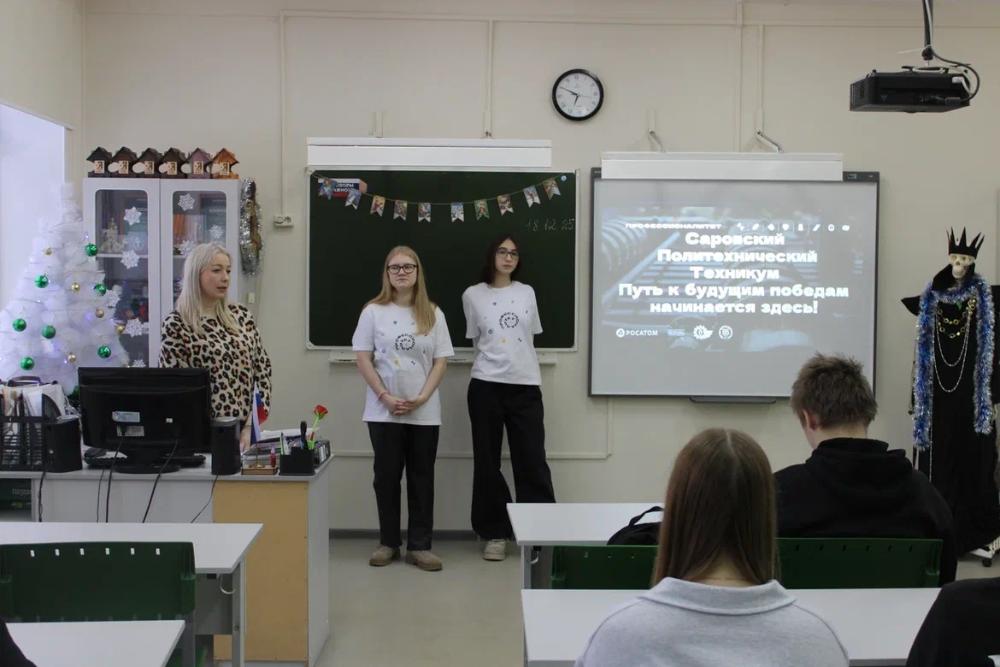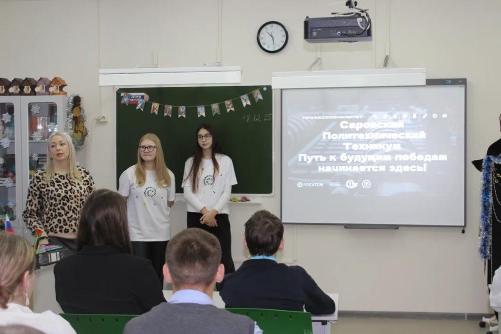 Наши яркие амбассадоры Профессионалитета из Саровского политехнического техникума — Дарья Михеева и Амина Васинькина и советник директора по воспитанию Анна Игоревна Щербинина — провели увлекательное занятие для учеников 8 и 9 классов в Сатисской средней школе.