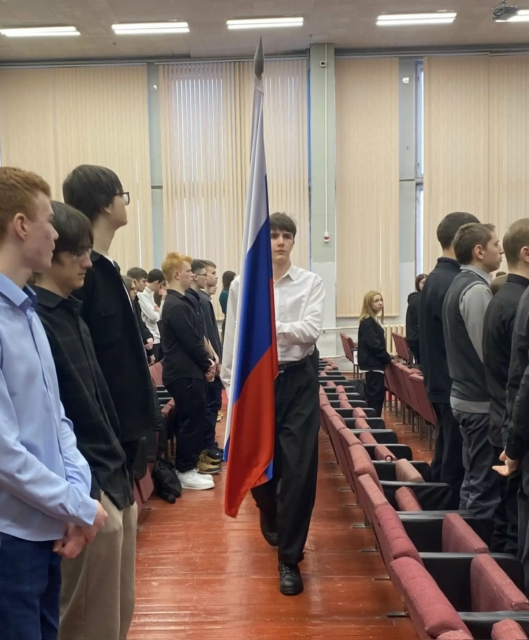 В актовом зале техникума морозное утро понедельника ознаменовано вносом флага и исполнением гимна Российской Федерации.