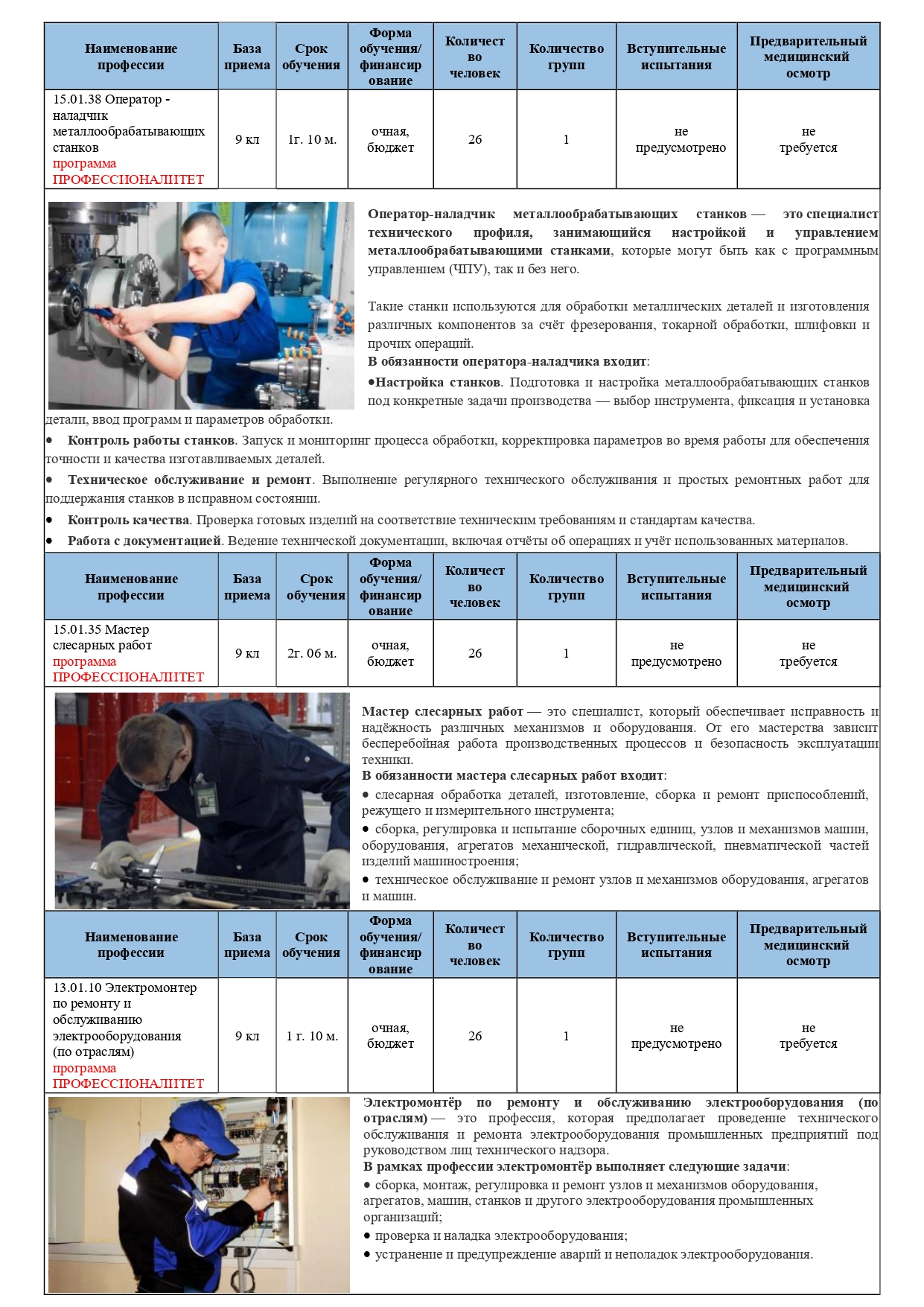 проводится по следующим профессиям и специальностям